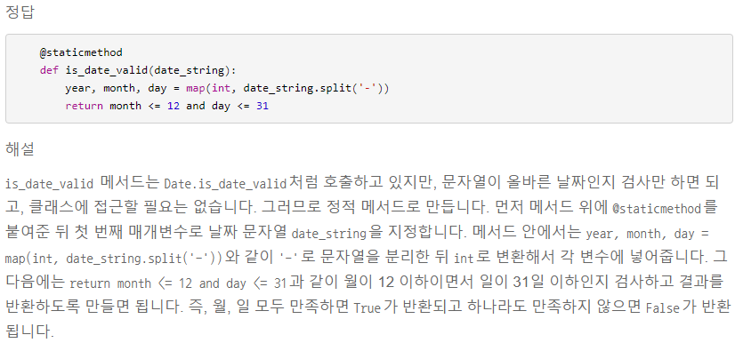 class Date: @staticmethod def is_date_valid(time): year, month, day = map(int, time.split('-')) # 리스트나 튜플로 감싸주지 않았음 print(year, month, day) Date.is_date_valid('2000-01-20') :: 2000 1 20if 문의 역할은 비교 연산자를 이용하여 return으로 반환하는 것으로 해결