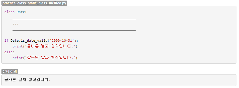 class Date: @staticmethod def is_date_valid(time): year, month, day = map(int, time.split('-')) # 리스트나 튜플로 감싸주지 않았음 print(year, month, day) Date.is_date_valid('2000-01-20') :: 2000 1 20if 문의 역할은 비교 연산자를 이용하여 return으로 반환하는 것으로 해결