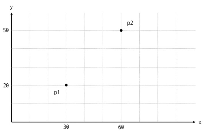 class Point2D: def __init__(self, x, y): self.x = x self.y = y p1 = Point2D(30, 20) p2 = Point2D(60, 50) print('p1 {} {}'.format(p1.x, p1.y)) # p1 30 20 print('p2 {} {}'.format(p2.x, p2.y)) # p2 60 50## 아래 p1 과 p2를 2차원 평면상에 표현하면 아래와 같다.