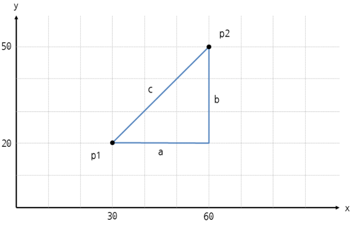 a = p2.x - p1.x b = p2.y - p1.y print(a) # 30 print(b) # 30## 해당 문제에서는 a가 -가 되는 것을 고려하지 않아도 된다. 제곱을해서 어짜피 부호가 +가 되기때문이다.