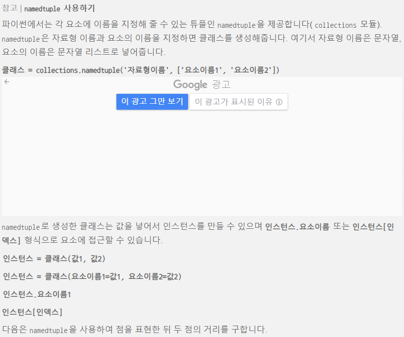 # 파이썬에서는 각 요소에 이름을 지정해 줄 수 있는 튜플인 namedtuple을 제공합니다( collections 모듈)