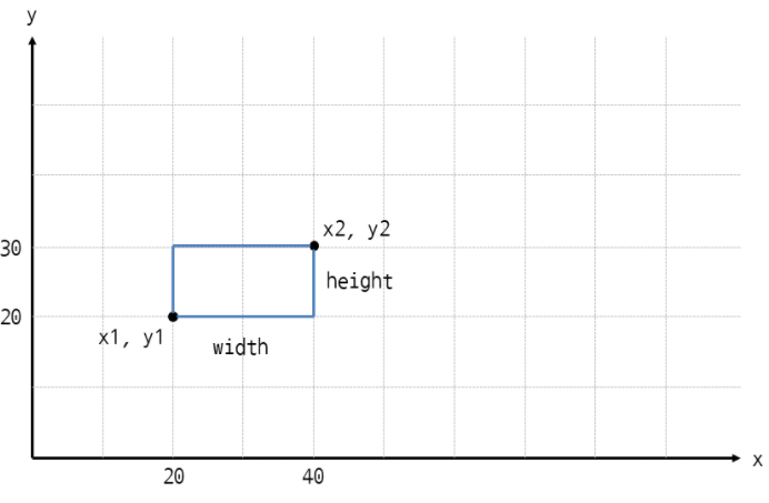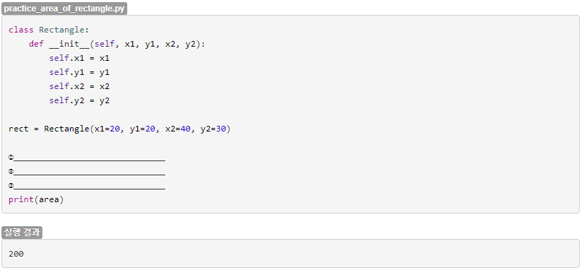 class Rectangle: def __init__(self, x1, y1, x2, y2): self.x1 = x1 self.y1 = y1 self.x2 = x2 self.y2 = y2 rect = Rectangle(x1=20, y1=20, x2=40, y2=30) a = rect.x2 - rect.x1 # abs를 써 절대값으로 만들어주는것으로 하자 b = rect.y2 - rect.y1 area = a * b print(a) # 20 print(b) # 10 print(area) # 200