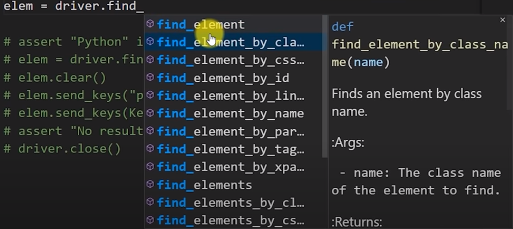 from selenium import webdriver from selenium.webdriver.common.keys import Keys driver = webdriver.Firefox() driver.get("http://www.python.org") assert "Python" in driver.title elem = driver.find_element_by_name("q") elem.clear() elem.send_keys("pycon") elem.send_keys(Keys.RETURN) assert "No results found." not in driver.page_source driver.close()예시코드를 붙혀넣기를 하면, vs코드에 빨간 줄이 생기는데