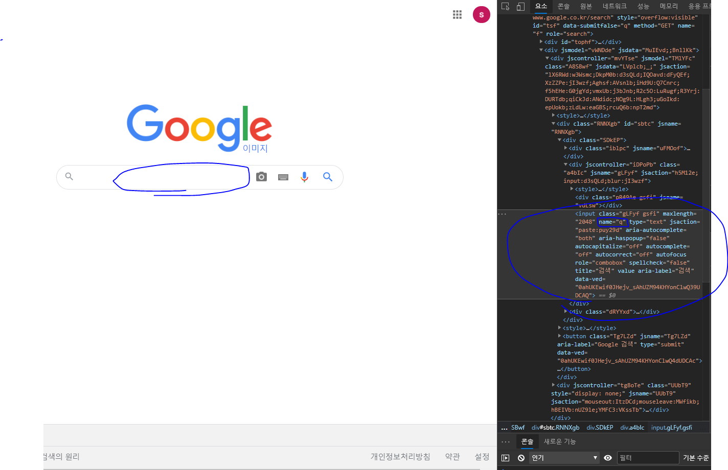 구글의 개발자도구로 입력창을 확인하여 이름은 무엇인지, 클래스 명은 무엇인지 등 정보를 확인할 수 있다.