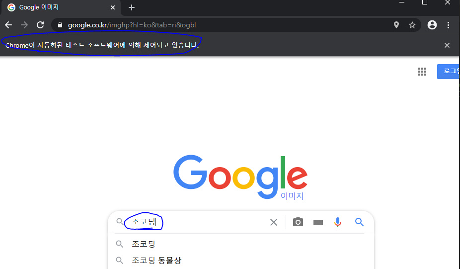 from selenium import webdriver from selenium.webdriver.common.keys import Keys driver = webdriver.Chrome() driver.get("https://www.google.co.kr/imghp?hl=ko&tab=ri&ogbl") elem = driver.find_element_by_name("q") elem.send_keys("조코딩") # send_keys를 이용해서 우리가 원하느 값인 (조코딩)을 넣어준다. elem.send_keys(Keys.RETURN) # 검색어에 조코딩 입력후 엔터(검색실행)
