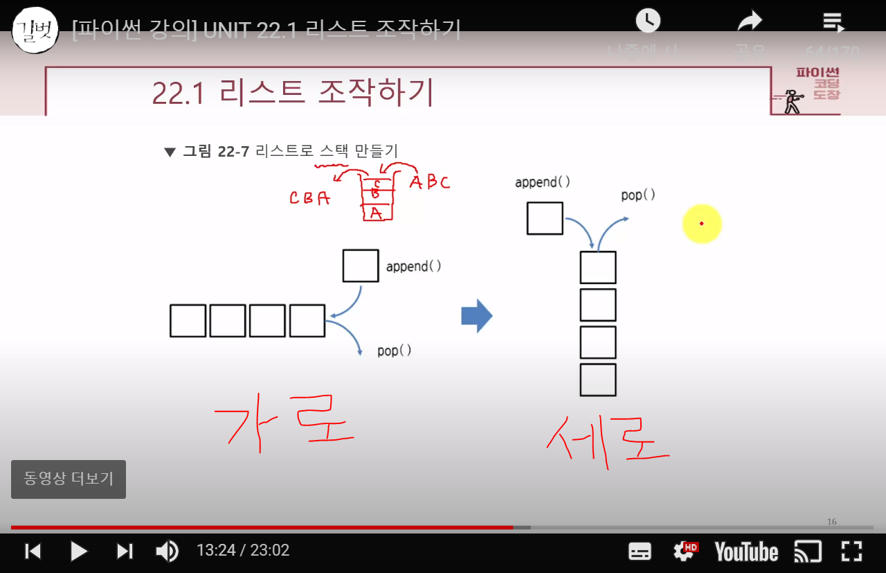 지금까지 알아본 리스트의 메서드로 스택(stack)과 큐(queue)를 만들 수 있습니다. 다음과 같이 append와 pop을 호출하는 그림을 90도 돌리면 스택의 모습이 됩니다.