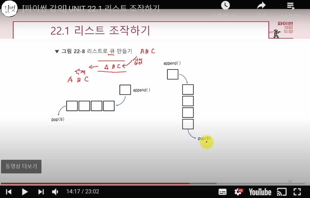 물론 append(), pop(0)이 아닌 insert(0, 요소), pop()을 사용해서 추가/삭제 방향을 반대로 해도 큐가 됩니다.