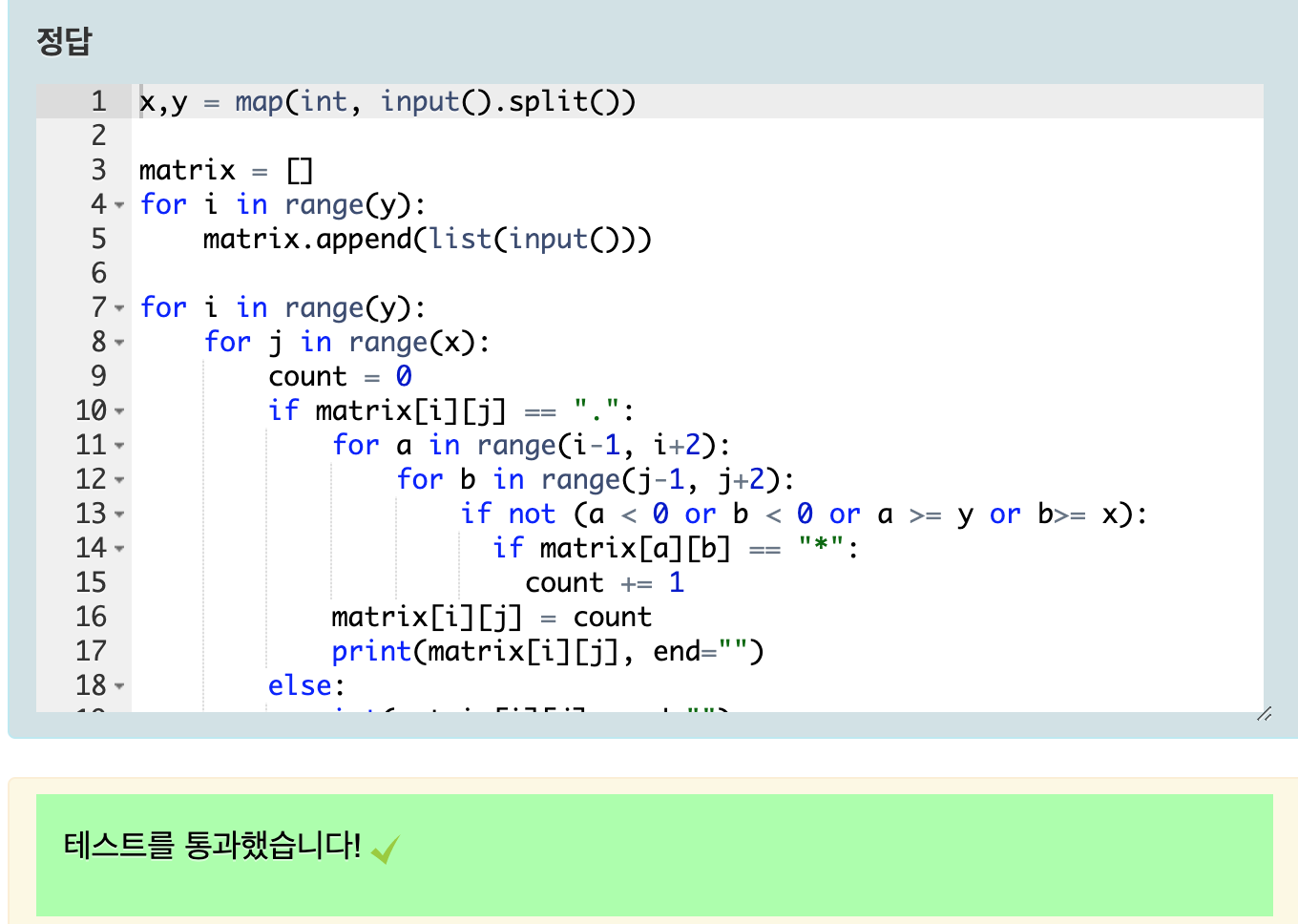 기준을 어디에 두느냐에 따라 다양한 정답이 나올 수 있는 문제이며 첫번째 기준을 문자열 " . " 로 잡고 2차원 리스트의 인덱스 번호를 통해 접근하여 i -1, i+2 // j-1, j+2 (i, j 가로 세로 임의의변수) 로 인접한 8개의 요소를 체크할 수 있도록 for문과 결합하는 방식으로 진행하였다.