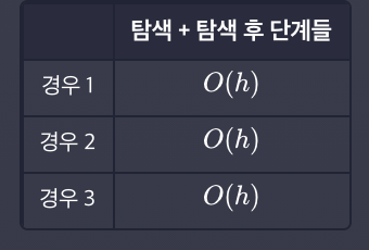 삭제 연산의 시간복잡도는 공통적으로 삭제하고자 하는 노드를 탐색하는 과정이 선행된다. O(H)