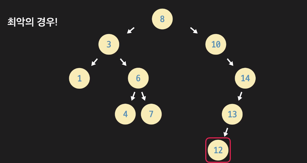 최악의 경우는 트리의 가장 깊이 있는 노드의 데이터를 탐색할때이다.