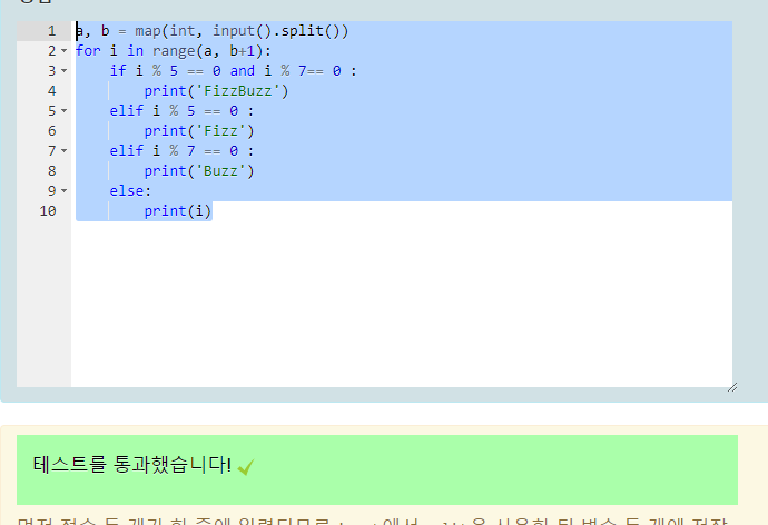 표준 입력으로 정수 두 개가 입력됩니다(첫 번째 입력 값의 범위는 1~1000, 두 번째 입력 값의 범위는 10~1000이며 첫 번째 입력 값은 두 번째 입력 값보다 항상 작습니다). 첫 번째 정수부터 두 번째 정수까지 숫자를 출력하면서 5의 배수일 때는 'Fizz', 7의 배수일 때는 'Buzz', 5와 7의 공배수일 때는 'FizzBuzz'를 출력하는 프로그램을 만드세요(input에서 안내 문자열은 출력하지 않아야 합니다).
