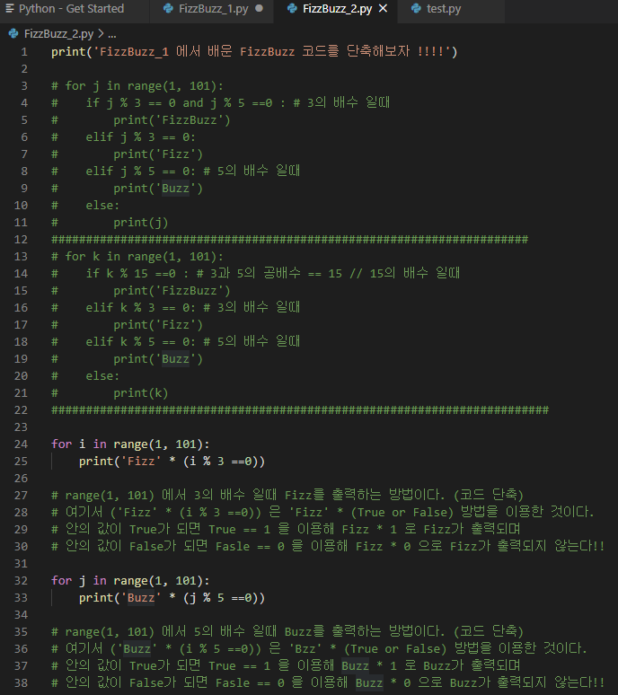 # 여기서 ('Fizz' * (i % 3 ==0)) 은 'Fizz' * (True or False) 방법을 이용한 것이다.