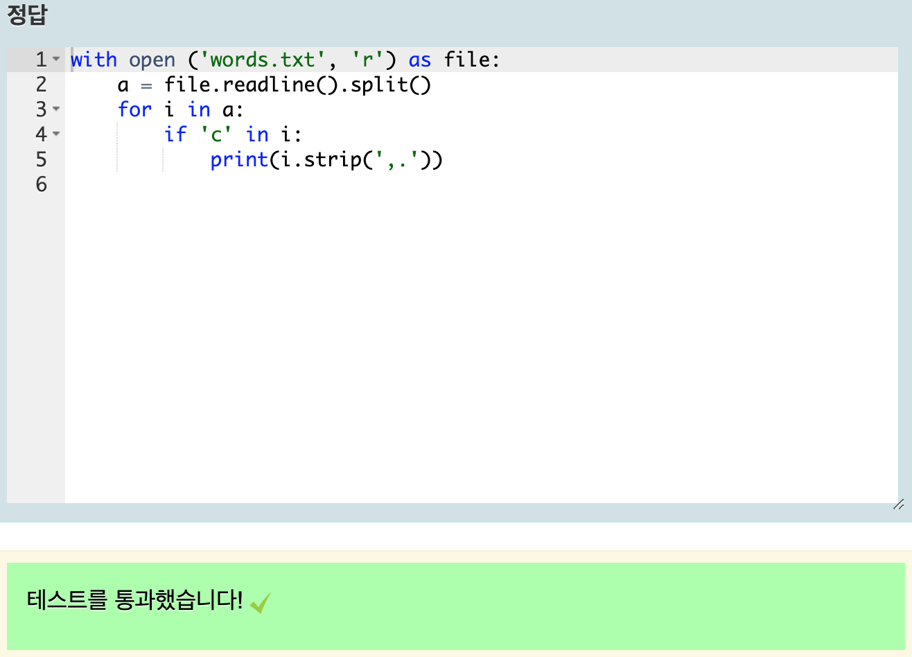 문자열이 저장된 words.txt 파일이 주어집니다(문자열은 한 줄로 저장되어 있습니다). words.txt 파일에서 문자 c가 포함된 단어를 각 줄에 출력하는 프로그램을 만드세요. 단어를 출력할 때는 등장한 순서대로 출력해야 하며 ,(콤마)와 .(점)은 출력하지 않아야 합니다.