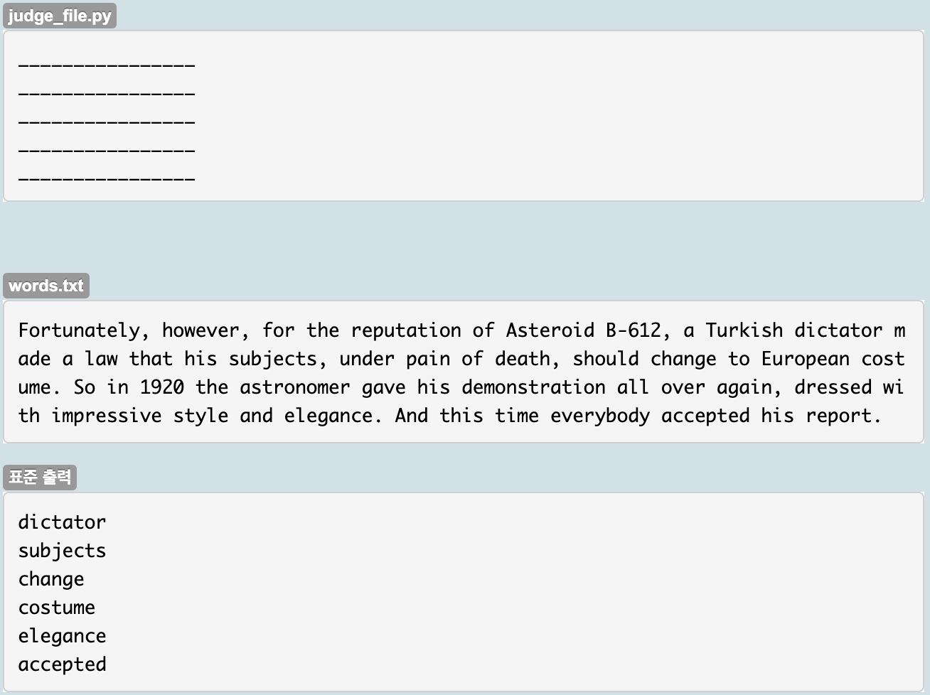 한줄로 줄바꿈 없이 입력되어 있는 내용을 split을 이용한 공백을 기준으로 리스트를 만들고 반복문으로 해당 요소를 검증하면서 출력하는 방법으로 접근방법은 어렵지 않다.